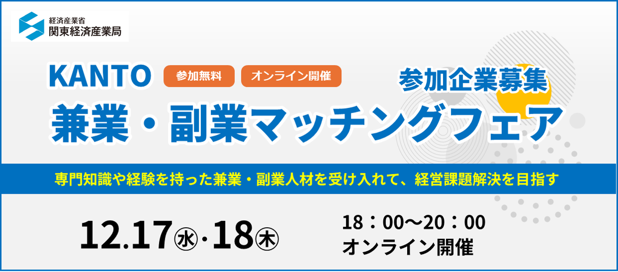 専門知識や経験・スキルを持った兼業・副業人材と企業とのオンラインマッチングイベントの参加企業を募集します。